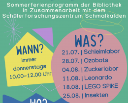 Die Stadt- und Kreisbibliothek bietet in Zusammenarbeit mit dem Schülerforschungszentrum Schmalkalden ein Sommerferienprogramm für Kinder an.