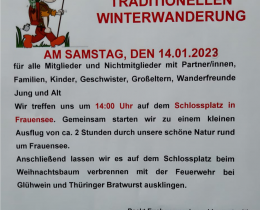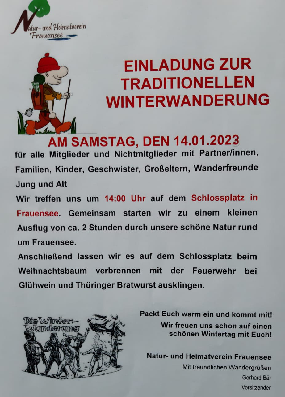 Winterwanderung in Frauensee Veranstaltungsort/Zeit Natur- und Heimatverein Frauensee e.V., Bad Salzungen, Samstag, 03. Februar 2024 - 13:00 - Samstag, 03. Februar 2024 mit dem Natur- und Heimatverein Frauensee
